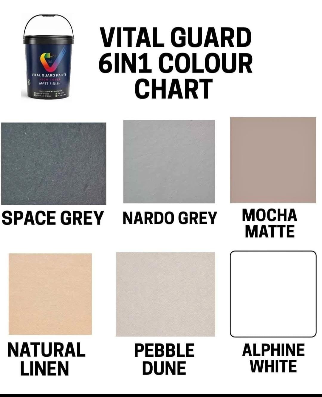 Vital Guard 6IN1 All In One is a versatile multi-surface coating that acts as a primer, undercoat, top coat, sealer, paving paint, and roof paint in one product. Available in 20L and in Alpine White, mocha matte, natural linen, nardo grey, space grey, and pebble dune, it delivers durable, weather-resistant protection with a smooth professional finish.